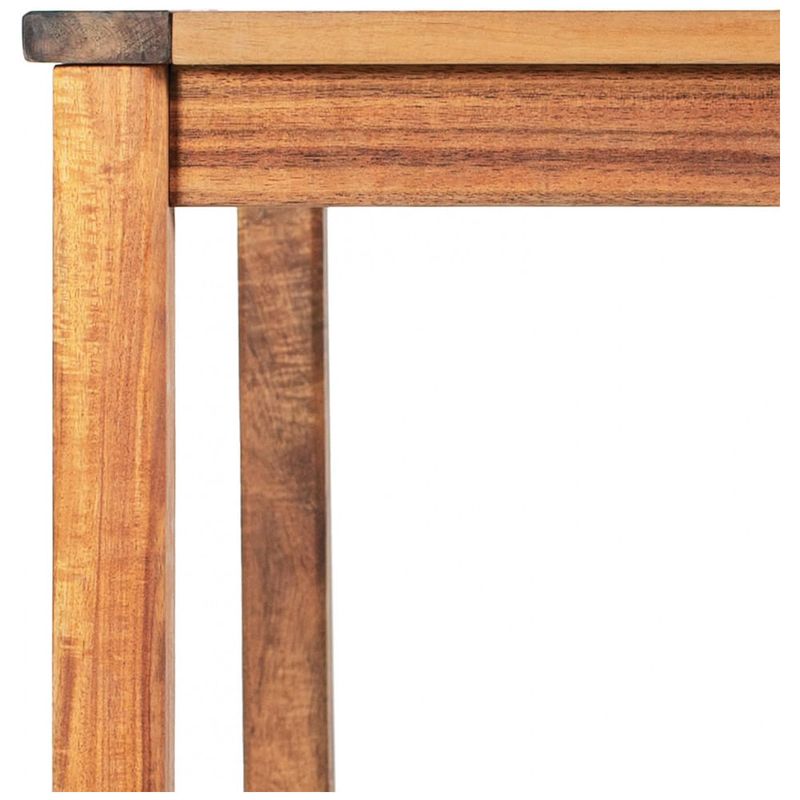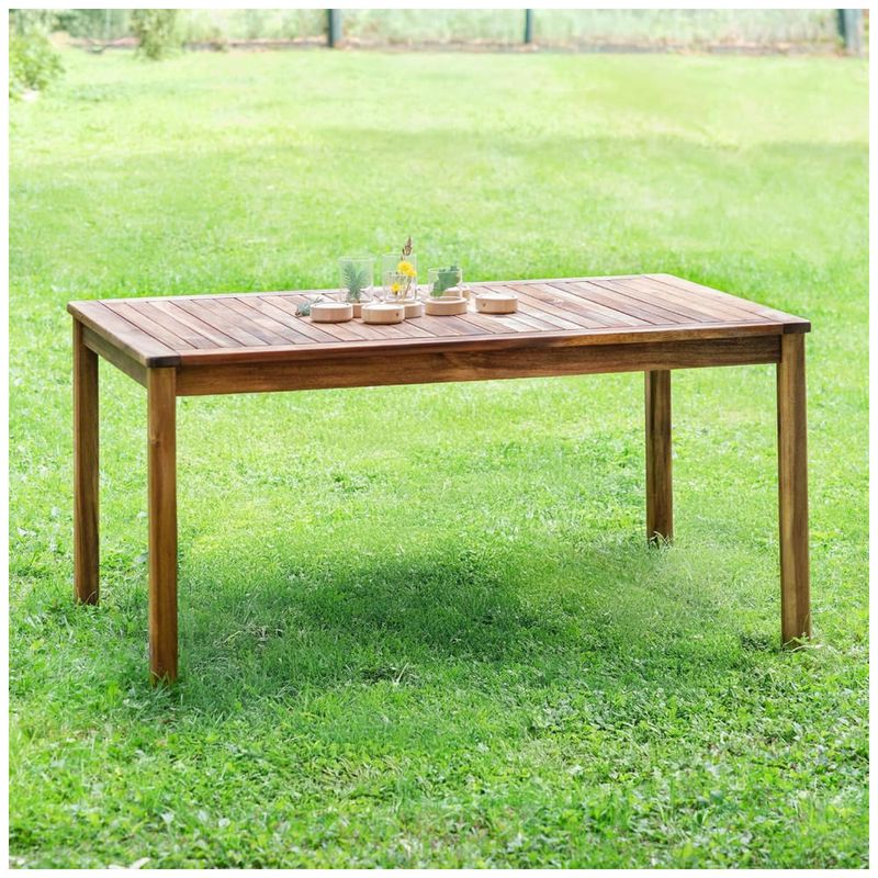 A estrutura é produzida em madeira maciça de acácia, naturalmente resistente às intempéries, projetada para suportar exposição ao sol, chuva e umidade ao longo do ano, desde que sejam seguidas as rotinas de manutenção indicadas para móveis externos. O tampo e a base com pés retos garantem estabilidade em superfícies planas e permitem combinar a mesa com bancos, banquetas ou cadeiras da linha Acadia (vendidos separadamente), compondo layouts flexíveis de mobiliário para crianças.?