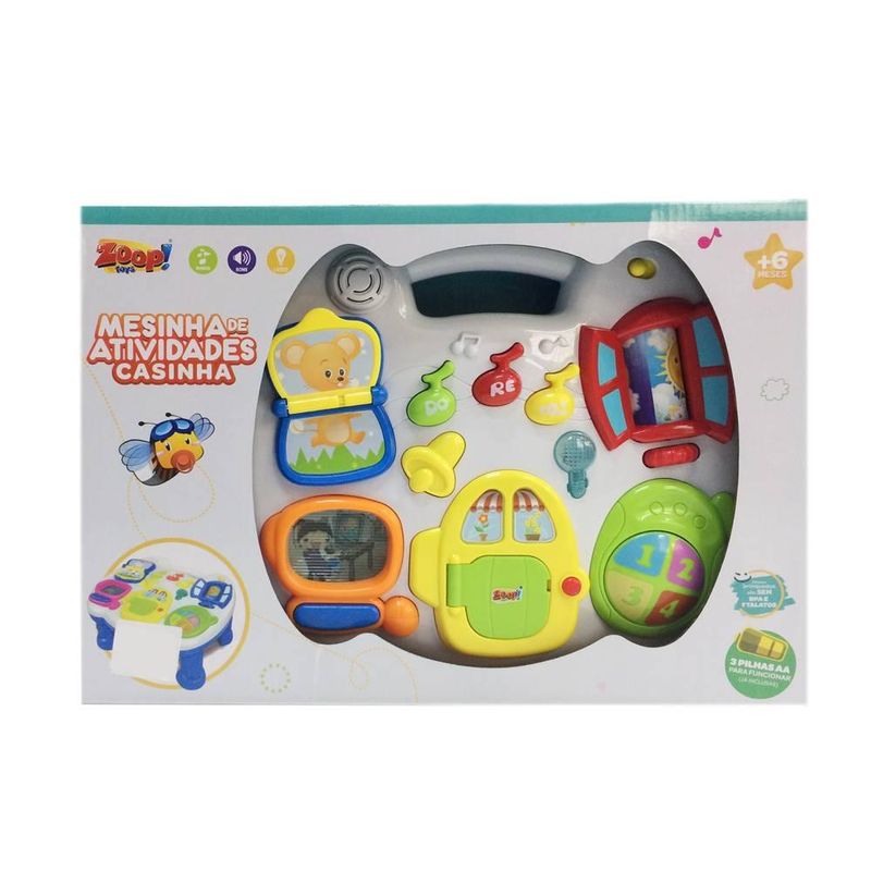 Mesinha de Atividades Casinha Com Luz E Som - Zoop Toys ZP00671 - Com: Celular, Sino, Computador, Notas Musicais, Janela, Botão liga/desliga. - Livro de bichinhos: Ao virar a página, irá acender uma luz e emitir o som do respectivo animal. - Janelinha: Role o botão para ver os modos dia e noite, ao dia o galo cantará, no modo noite você ouvirá o som da coruja e grilo. Em ambos os casos as luzes piscarão. - Casa: Pressione o botão do lado direito da casa e a porte será aberta e a campainha emitirá um som e piscará a luz ao mesmo tempo. Pressione o botão do cachorro dentro da casa e você ouvirá latido de cão com as luzes piscando. Imagens ilustrativas, cores podem variar.