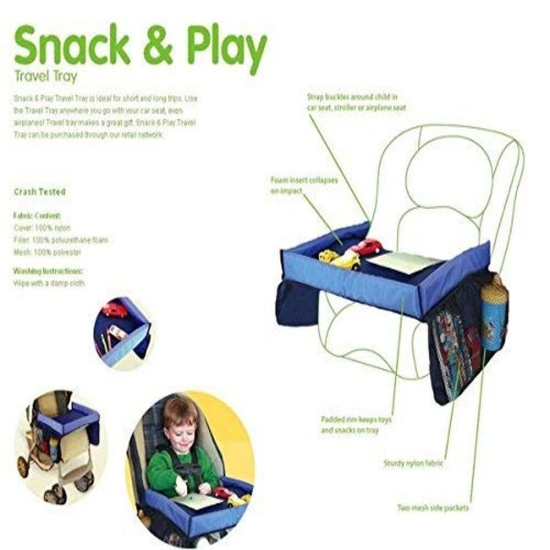 Feita de nylon macio e durável com reforço de espuma macia e dobrável, a bandeja fivela em torno de seu filho no assento do carro ou carrinho de criança. Fácil e seguro de usar, também é lavável.