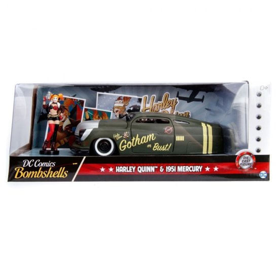 Miniatura carro Ford Mercury (1951), com figura Harley Quinn, Metals Die Cast, na escala 1:24.