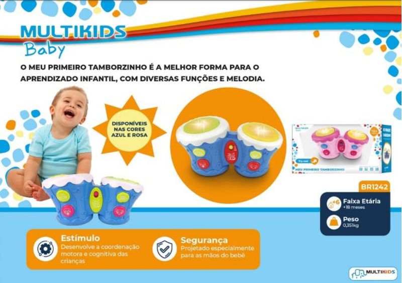 O Meu Primeiro Tamborzinho Com Som Multikids é o melhor para o aprendizado e desenvolvimento dos pequenos! Através da descoberta de sons, melodias e luzes, o Tamborzinho estimula a coordenação motora, aprendizado musical e o desenvolvimento infantil. Disponível na cor azul, possui diversos botões e sons para deixar a brincadeira ainda mais dinâmica e divertida, feito em material resistente e projetado para bebês a partir dos 18 meses de idade. Utiliza 2 pilhas AA inclusas. Imagens meramente ilustrativas Características: - Conteúdo da Embalagem: 1 Meu Primeiro Tamborzinho Azul Com Luz e Som Multikids Baby- Marca: Multikids- Modelo: BR1242- Dimensões da Embalagem: 30cm, 16,5cm, 14cm- Código de Barras: 7899838896076- Alimentação: Utiliza 2 pilhas AA incluídas- Certificação: INMETRO Recomendado para maiores de 18 meses. Importante: - Nossos produtos encontram-se em estoque- Todos os produtos são lacrados- Produtos acompanham nota-fiscal e garantia