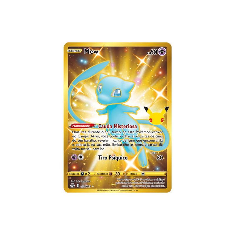 Diretamente do mundo Pokémon da Coleção de Celebrações, adquira uma carta metalizada(foil) com uma linda arte do Pokémon mais fofo e poderoso, o Mew Dourado!