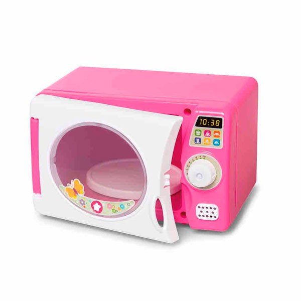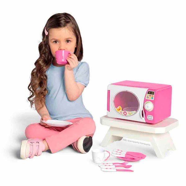 O Micro-ondas vem com botão que gira e faz barulhinho igual ao micro-ondas de verdade para avisar quando a comidinha estiver pronta.