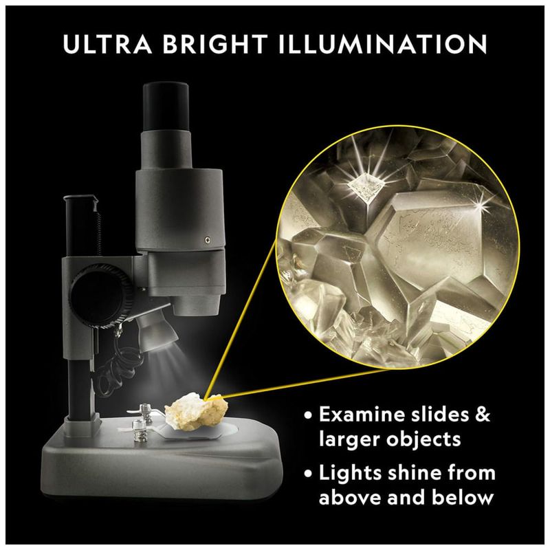 DOIS MICROSCÓPIOS EM UM Use as luzes LED inferiores para visualizar espécimes biológicos em slides ou mude para as luzes superiores para examinar objetos 3D em detalhes intrincados. A atividade STEM perfeita para meninos e meninas.