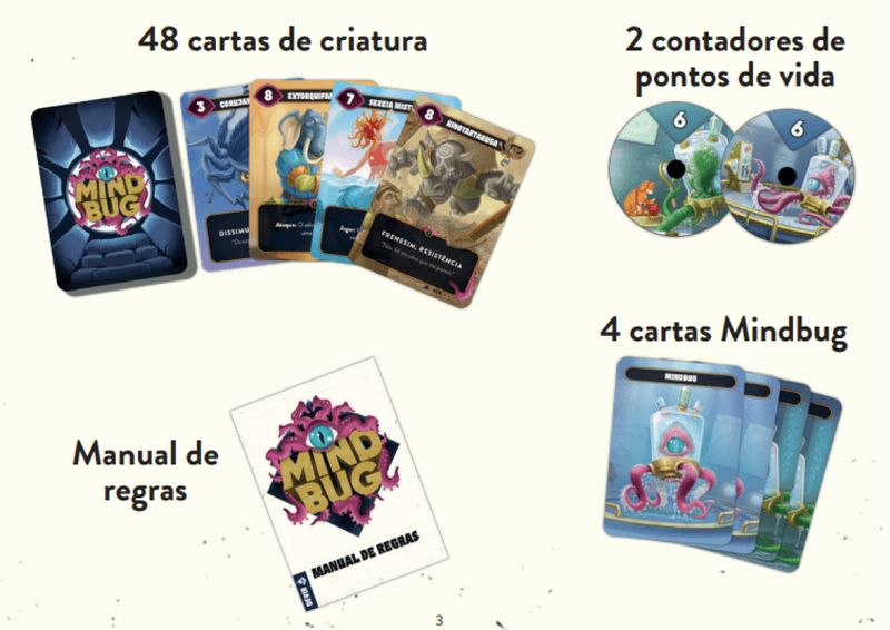 As cartas no Mindbug representam criaturas estranhas que vêm com habilidades únicas e poderosas, como Dragão Composto, Hidra Caracol ou Rex Kangasaurus. Cada jogador começa o jogo com dez cartas de criatura (cinco na mão e cinco em uma pilha de compra) e tenta usá-las para reduzir o total de pontos de vida do oponente a zero. Além disso, cada jogador recebe duas cartas de Mindbug que podem ser usadas para controlar a mente de uma criatura adversária quando ela for jogada. Este inovador mecanismo Mindbug é o núcleo do jogo e leva a um processo de tomada de decisão único que faz o Mindbug parecer totalmente diferente de qualquer outro jogo de cartas.
