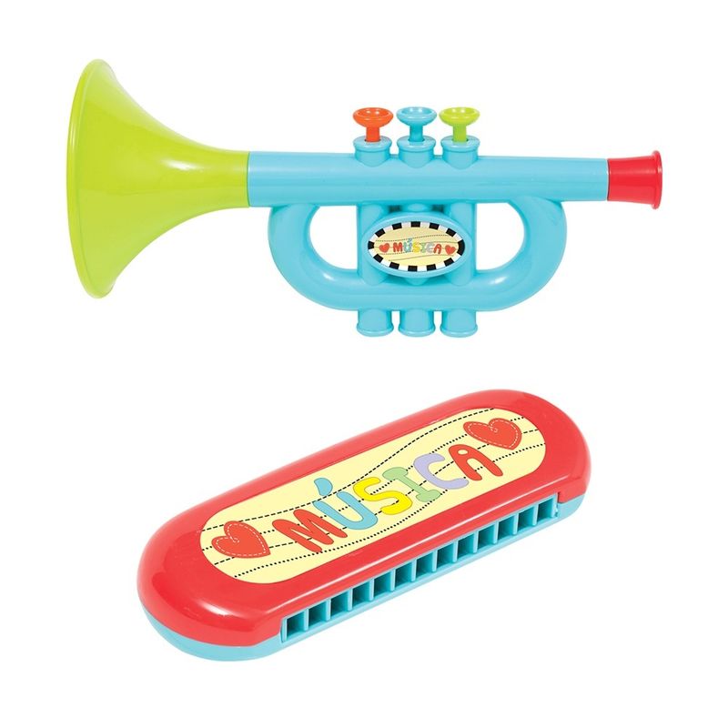 Contém: 1 tambor, 2 baquetas, 2 castanholas, 2 maracas, 1 pandeiro, 1 corneta e 1 gaita