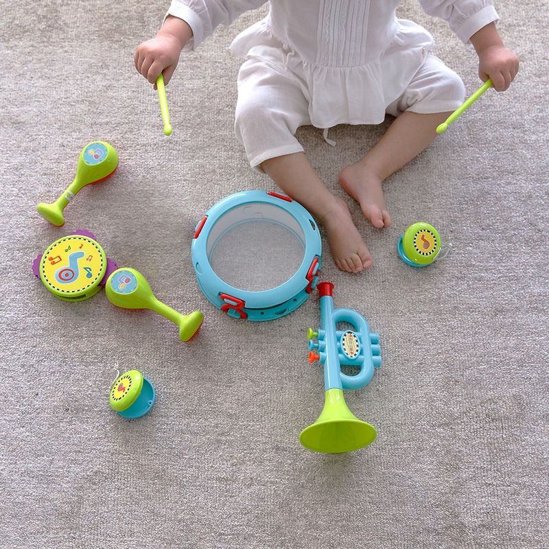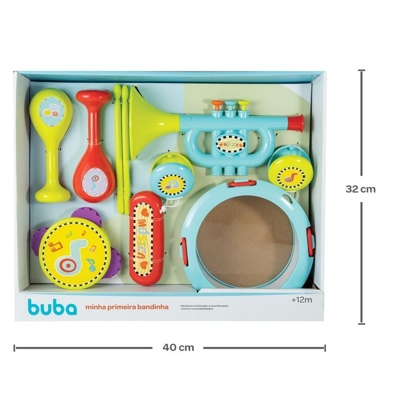 A Minha Primeira Bandinha, da Buba Baby, é fabricada em material de alta qualidade para garantir durabilidade e resistência durante o dia a dia. Muito divertido e alegre, conta com um tambor, duas baquetas, uma gaita, uma corneta, duas castanholas, duas maracas e um pandeiro para proporcionar uma experiência única e agradável ao bebê com a música, oferecendo a diversidade de itens que garantem ritmo, diversão e muita imaginação nas brincadeiras, além de um conhecimento geral dos instrumentos musicais. Indicado para crianças a partir de 12 meses, desenvolve a audição com sons dos instrumentos, praticando a sensibilidade tátil e a coordenação motora ao tocar, as habilidades musicais com um contato muito importante para auxiliar com o dom musical natural e a noção de ritmo e ainda permite que eles soltem a imaginação e a criatividade para brincar de montão. Completo, é perfeito para divertir seu bebê com originalidade e um cuidado todo especial.