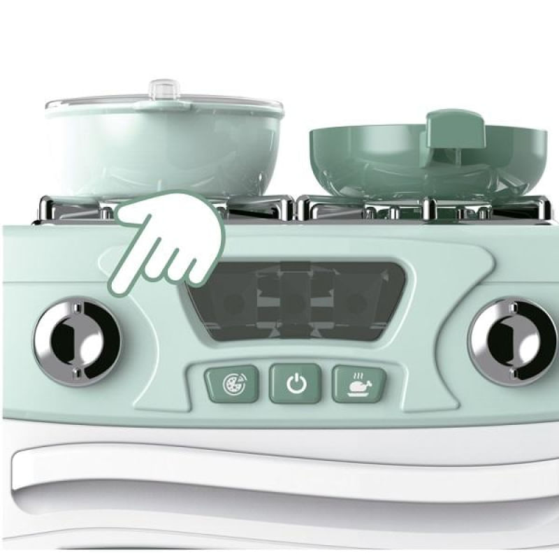 Aperte os botões para acender a luz e os sons O fogão é todo funcional. Vem com panelinhas e um frango para assar.