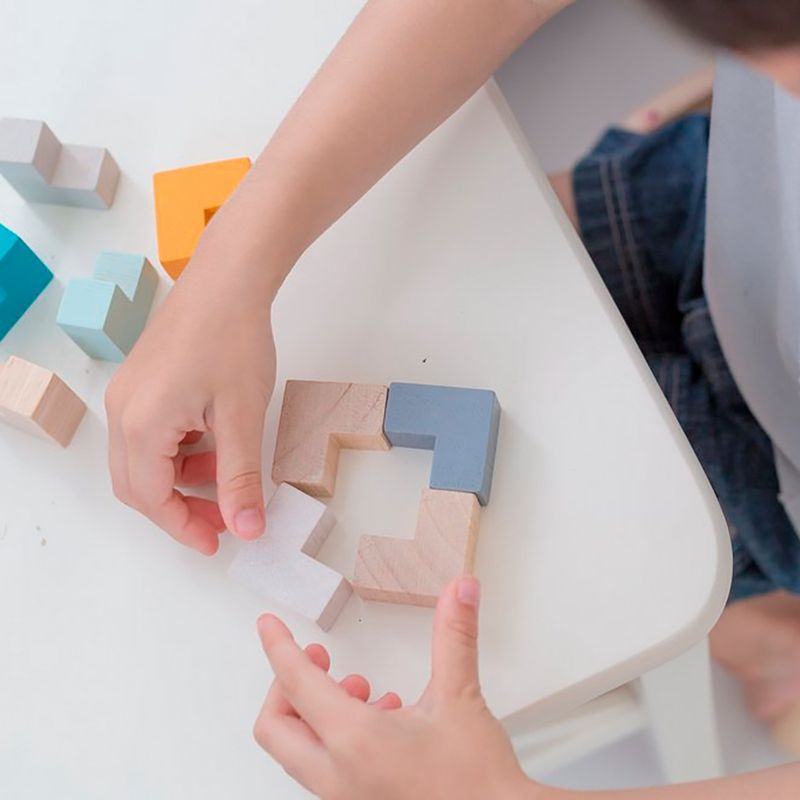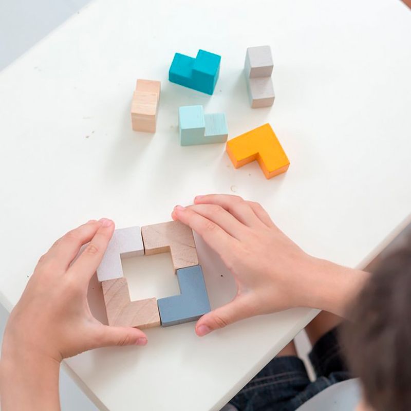 Desafie-se com este quebra-cabeça clássico! Aprenda a solucionar o cubo. Contém nove blocos de madeira em formato ‘L’ em diferentes cores.