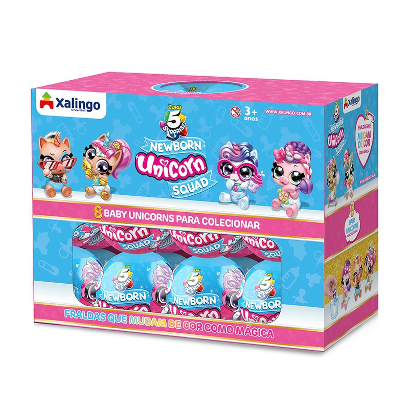 O Display 5 Surprise Baby Unicorn Xalingo contém com 24 bolinhas surpresa. Cada bolinha vem com 1 Mini Unicórnio, acessórios e 1 guia de colecionador. Descubra toda a magia desembrulhando seu bebê unicórnio! Fofos, perfumados e cheios de encanto, os oito colecionáveis ainda contam com acessórios incríveis. Cada bebê da linha Newbron Unicorn Squad vem com uma fraldinha que muda de cor na água e a bolinha que pode virar um berço ou uma banheira. Dimensões da bolinha: 8 cm de diâmetro. Indicado para crianças a partir dos 3 anos.