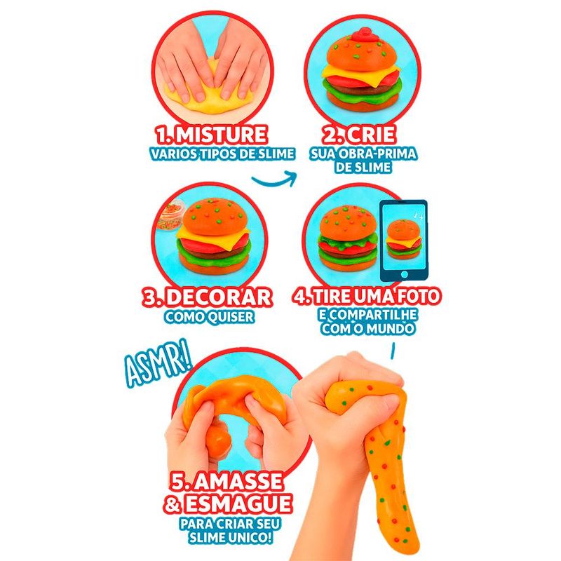Com o Mini Kit Slimy DIY Street Food Crush - Hamburger, as crianças podem criar hambúrgueres de slime superrealistas! Misture, modele e decore os ingredientes para fazer um hambúrguer único Depois de modelar, esmague para uma sensação cremosa e divertida Ideal para estimular a criatividade e habilidades motoras, oferecendo uma experiência sensorial incrível e segura