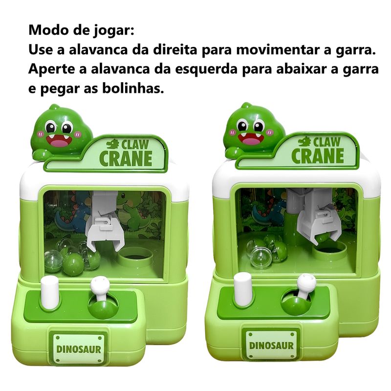 Mini Máquina de Pegar Bolinhas estilo Claw Crane com tema de dinossauro. Ideal para crianças fãs do universo geek que adoram desafios e brincadeiras criativas. Use as alavancas para mover e abaixar a garra, capturando as bolinhas como nas máquinas de pegar ursinhos. Estimula coordenação motora, raciocínio e diversão garantida! Perfeita para presentear, decorar o quarto infantil ou usar como lembrancinha em festas.
