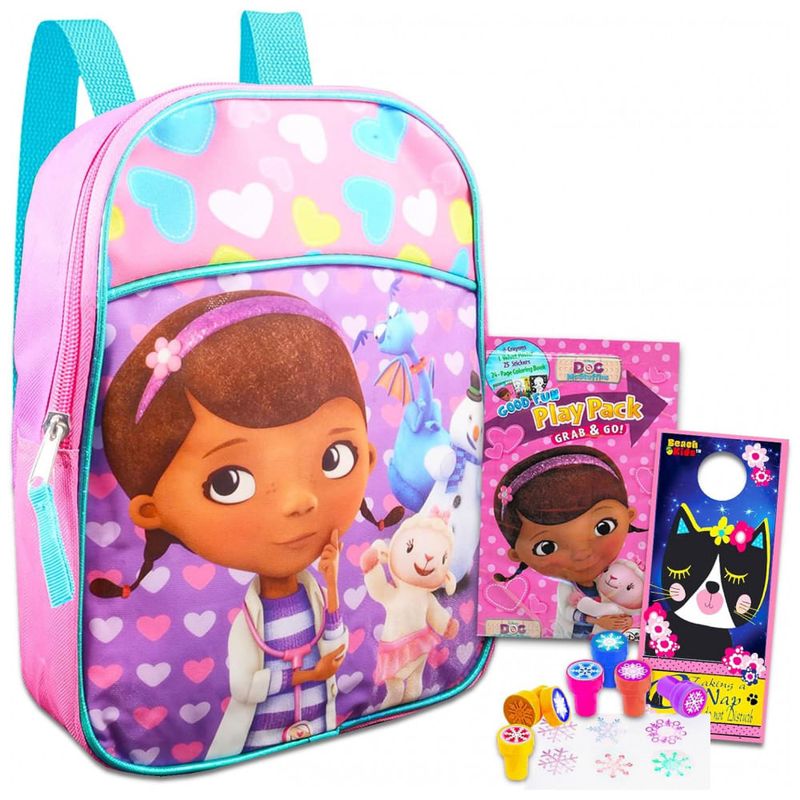 Perfeito em um conjunto de material escolar Doc McStuffins para meninas, a mini mochila Doc McStuffins é ótima para bebês e crianças pequenas que estão voltando para a escola.