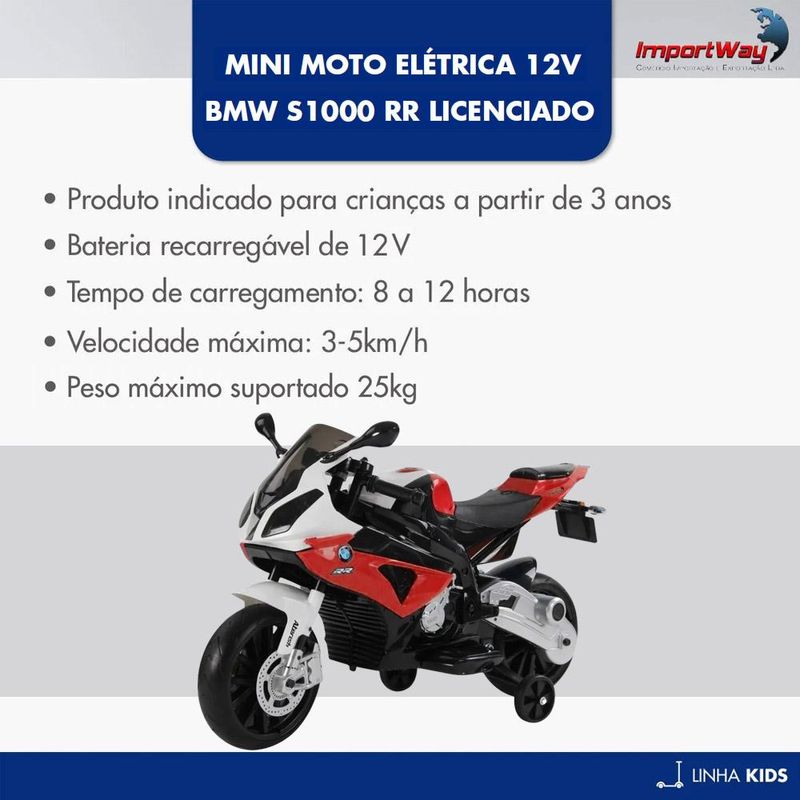 Com a mini moto elétrica BMW S1000 RR a diversão está garantida, por ser um produto licenciado possui detalhes realistas que fazem a criança se sentir dirigindo uma moto de verdade. Possui duas rodas e um par de rodas de apoio que geram maior estabilidade, trazendo mais segurança para a criança.