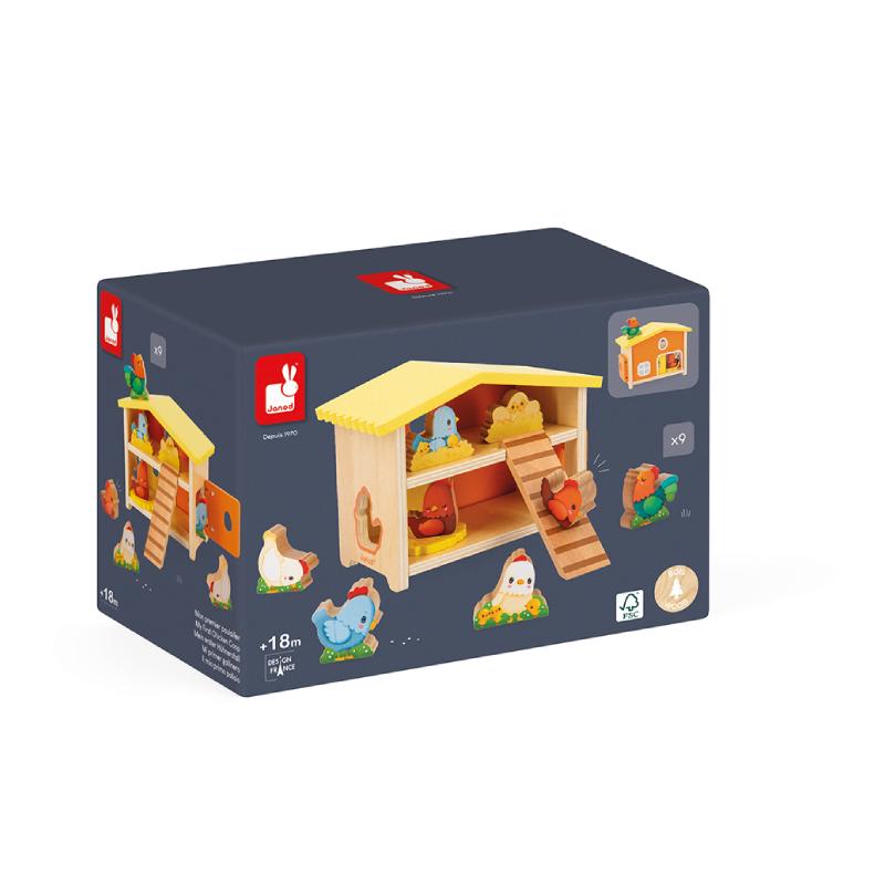 Com o formato de uma casinha, este brinquedo educativo vem com 9 acessórios, composto por 6 galinhas, 1 galo, 1 ninho com ovos para chocar, 1 ninho com um pintinho, indicado para bebês a partir dos 18 meses. Estimula a imaginação e coordenação motora fina. Os animais podem entrar de diferentes maneiras, como um separador de formas: por uma porta de correr na parte de trás do galinheiro, por uma porta com dobradiça elástica na lateral, por um buraco em forma de galinha ou até mesmo por uma escada removível. Este brinquedo para bebês é feito de madeira com certificação FSC.