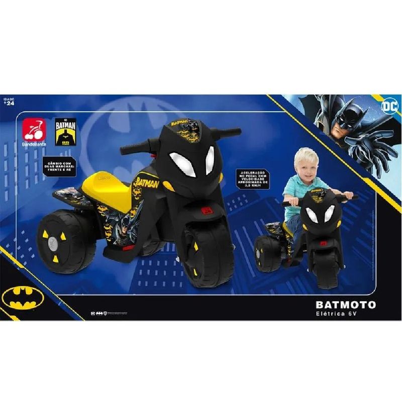 A Batmoto Elétrica 6V chega em uma versão renovada, mais leve e moderna. Com câmbio de duas marchas e aceleração progressiva no pedal, garante uma pilotagem suave e segura para muita diversão.