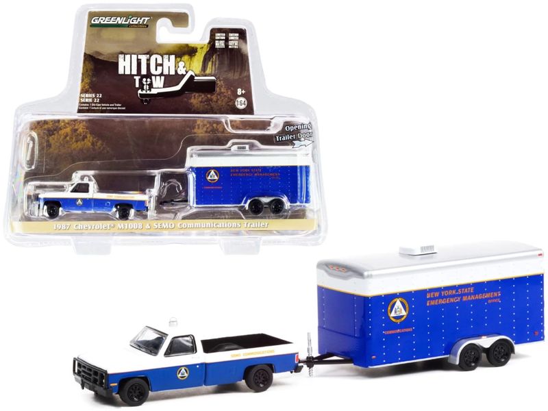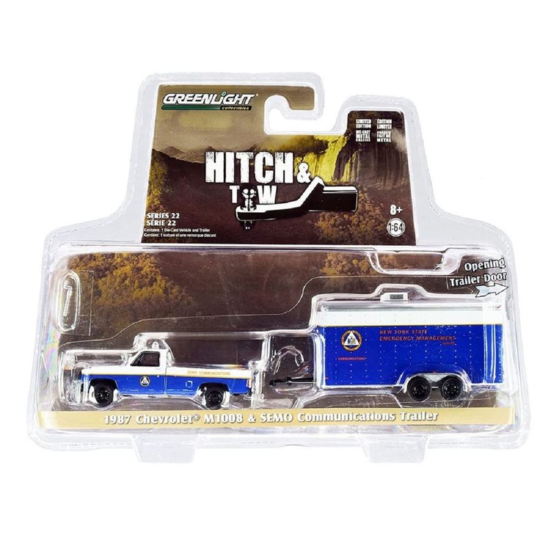 Miniatura de Picape Chevrolet M1008, 1987, Semo Communications Trailer, da coleção Hitch & Tow, Série 22, na escala 1:64.