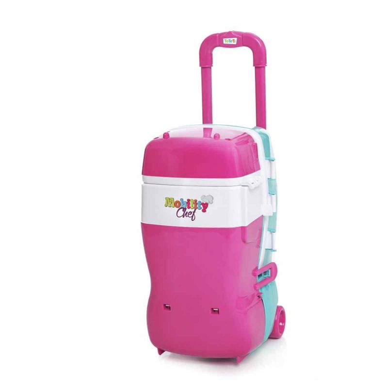 A Mobility Chef tem alça retrátil e rodinhas para sua super chef levar a brincadeira onde quiser!