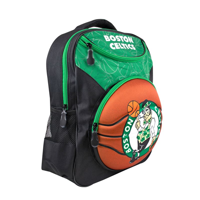 A mochila vem com painel traseiro acolchoado, alça de transporte superior acolchoada, duas alças de ombro acolchoadas e ajustáveis, dois bolsos externos nas laterais e bolso frontal com fechamento em ziper protegido por meia esfera de PVC moldado, 3D e o logo do seu time de basquete. Oficial do Boston Celtics. Infantil, Em poliester e com as cores dos Celtics. Maccabi Art.