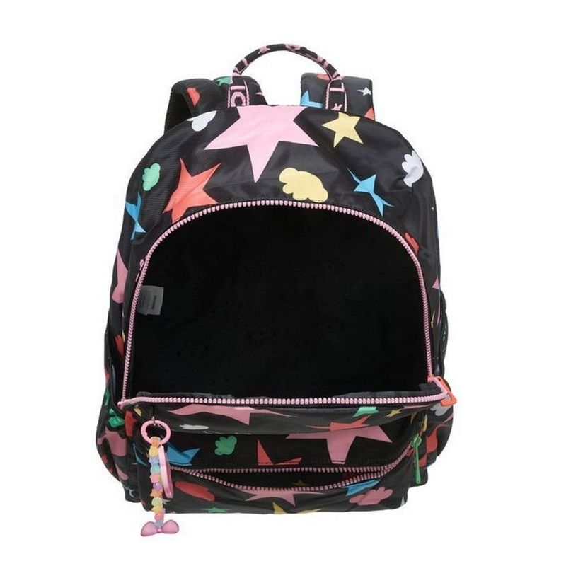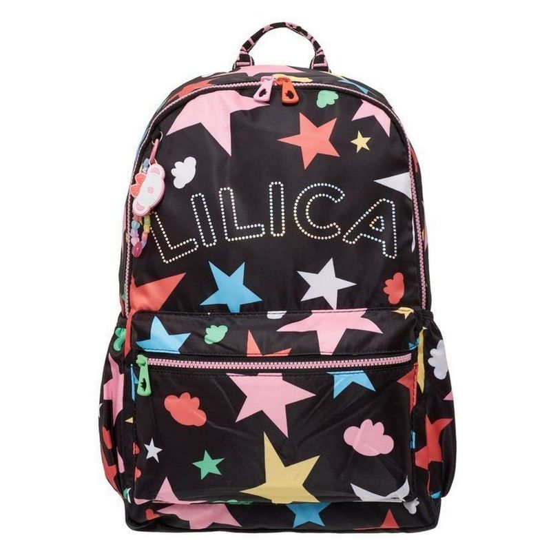 Estampa Moderna e Divertida: A mochila tem um fundo preto que destaca a estampa de estrelas e nuvens coloridas, além do nome da Lilica em um material que muda de cor. É um design moderno e super criativo!Espaço e Organização: Possui um compartimento principal espaçoso com zíper, ideal para guardar cadernos, livros e estojos. O bolso frontal é ideal para itens menores que precisam estar sempre à mão, e as redinhas laterais são perfeitas para garrafinhas.