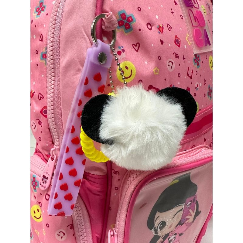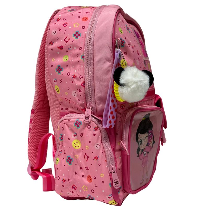 A mochila de costas oficial da Luluca é Confeccionadas em material soft com patch do Pandalu com glitter. Mochilas com chaveiro e com bolso transparente para trocar a estampa da roupa da Luluca.