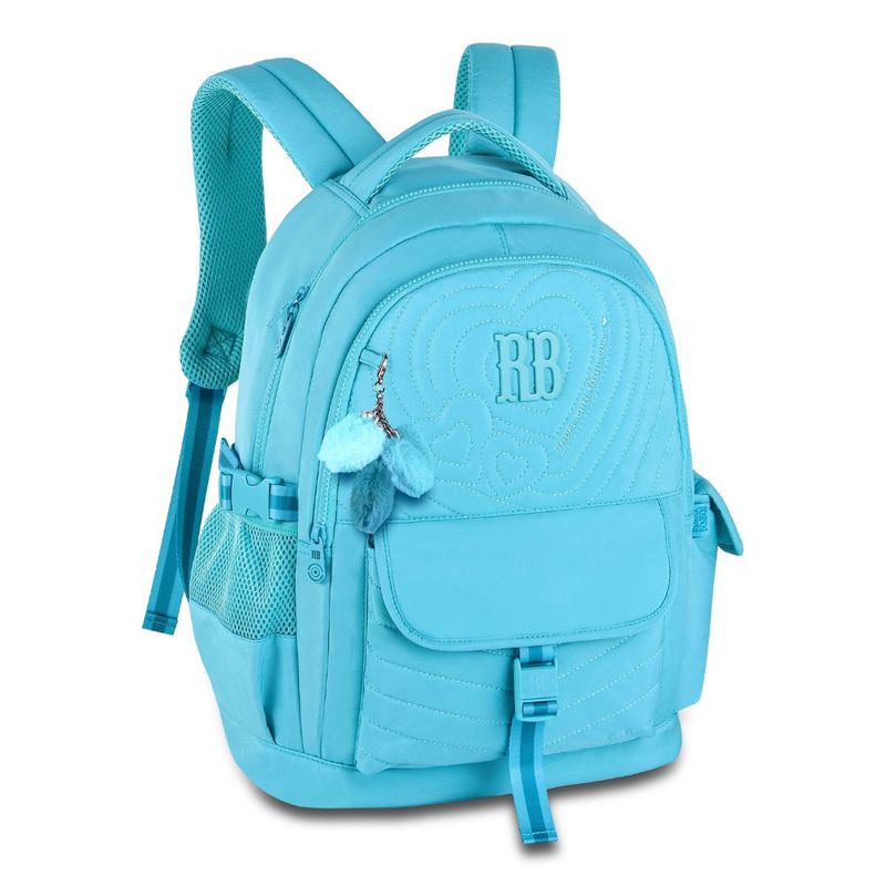 Confeccionadas em material soft com matelassê e placa de metal colorido. Mochilas com chaveiro de pompom triplo de corações.