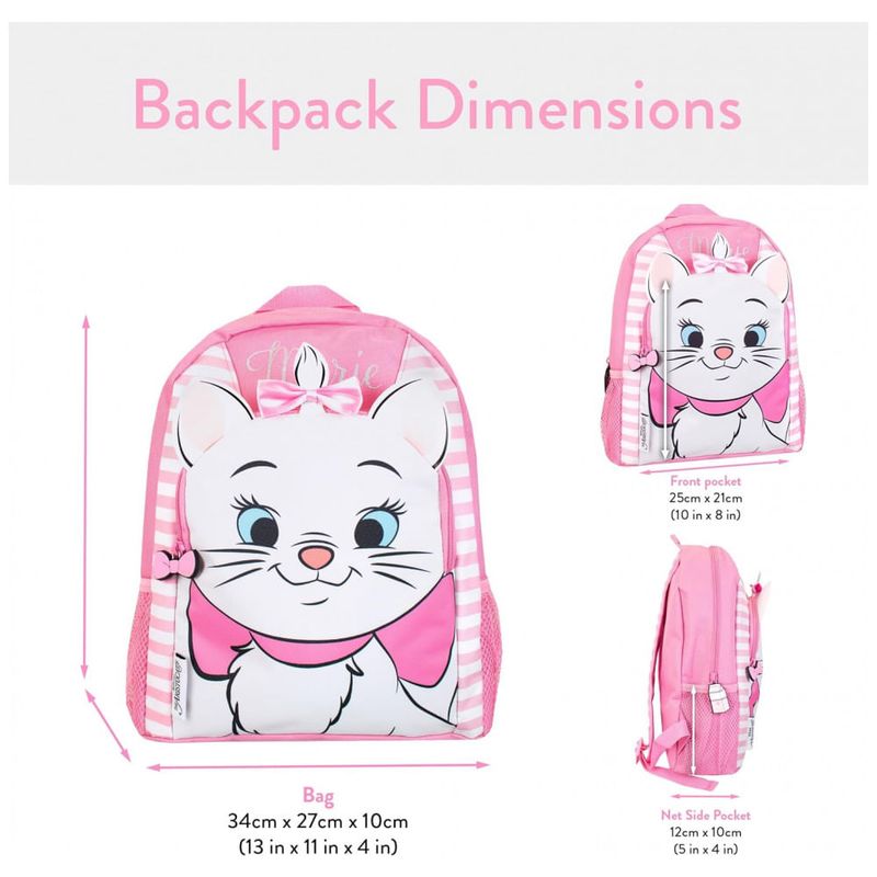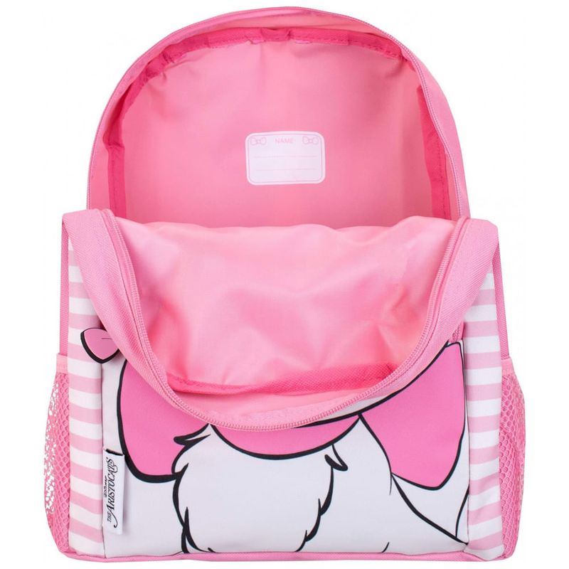 Esta bolsa fofa tem bastante Cat tiude. Apresenta um design Marie com orelhas e laço 3D, além de listras rosa e seu nome em glitter prateado.