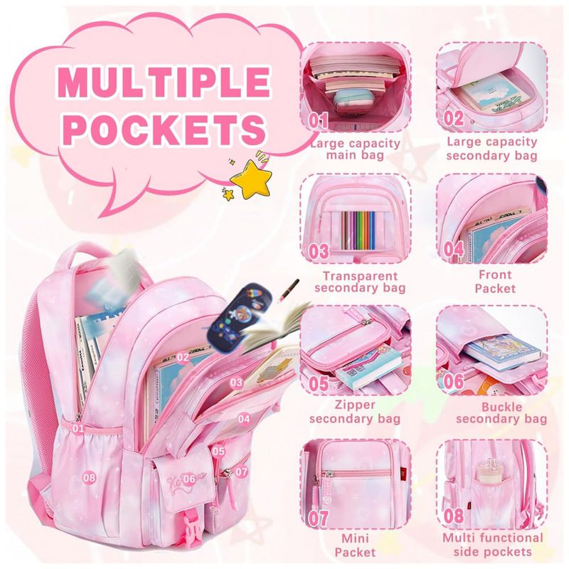 Mochila escolar infantil SPORTBANG em conjunto de 3 peças, formada por mochila, estojo transparente e chaveiro de pompom, indicada para meninas em idade escolar que precisam transportar livros, cadernos e materiais de uso diário com boa capacidade interna. A mochila possui aproximadamente 31 cm de largura, 16 cm de profundidade e 44 cm de altura, oferecendo volume em torno de 22 litros distribuído em compartimentos principais, bolsos externos e bolsos laterais.