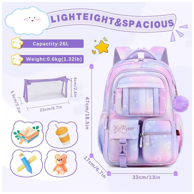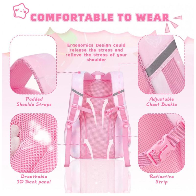 O design utiliza tonalidade roxa e aplicação de detalhes delicados, mantendo aparência infantil e adequada ao ambiente escolar. As alças de ombro são acolchoadas, ajustáveis e produzidas com material respirável, em conjunto com painel traseiro acolchoado para favorecer conforto e melhor distribuição de carga durante o uso prolongado.