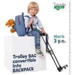 A estrutura tipo trolley possui alça retrátil, rodinhas e alças de ombro acolchoadas ajustáveis, permitindo o uso como mala de rodinhas ou como mochila nas costas, conforme a necessidade. O compartimento principal com zíper comporta roupas leves, lancheira pequena e brinquedos, contando ainda com bolsos internos, bolsos laterais, etiqueta interna para nome e patch refletivo para maior visibilidade.