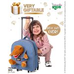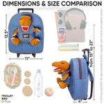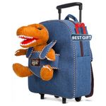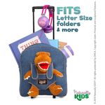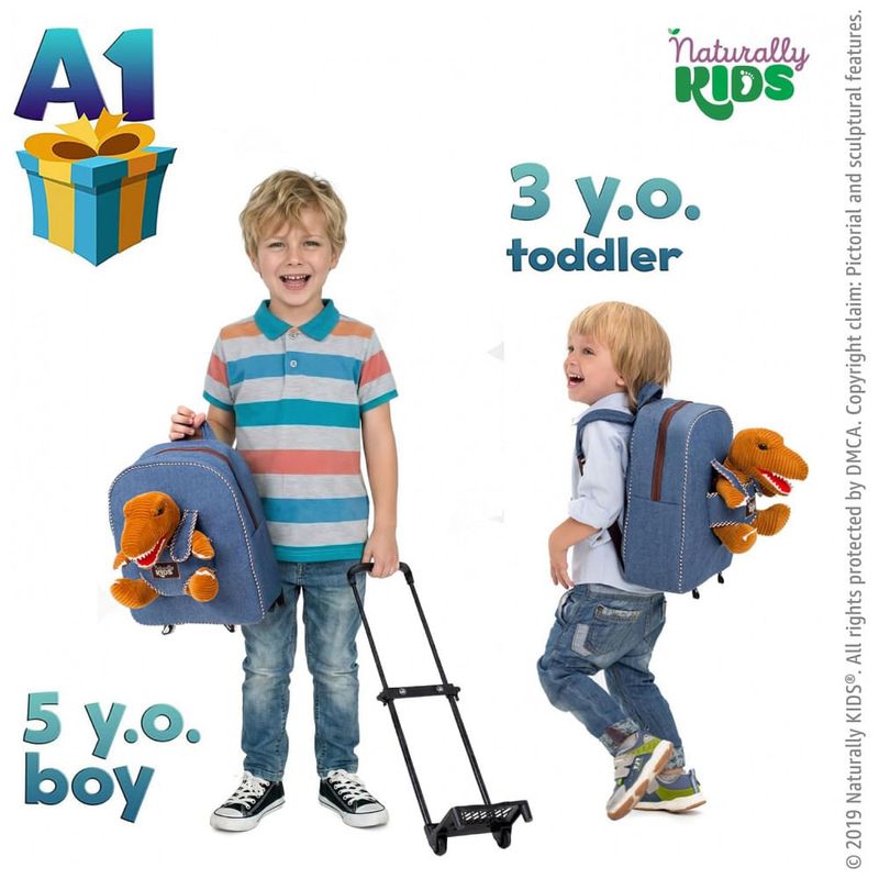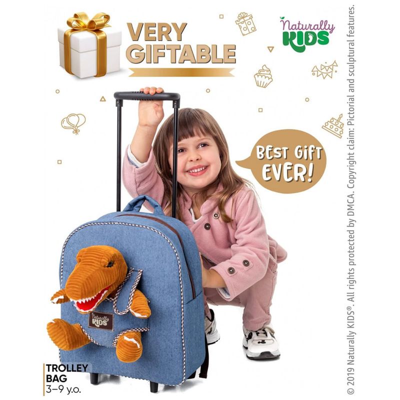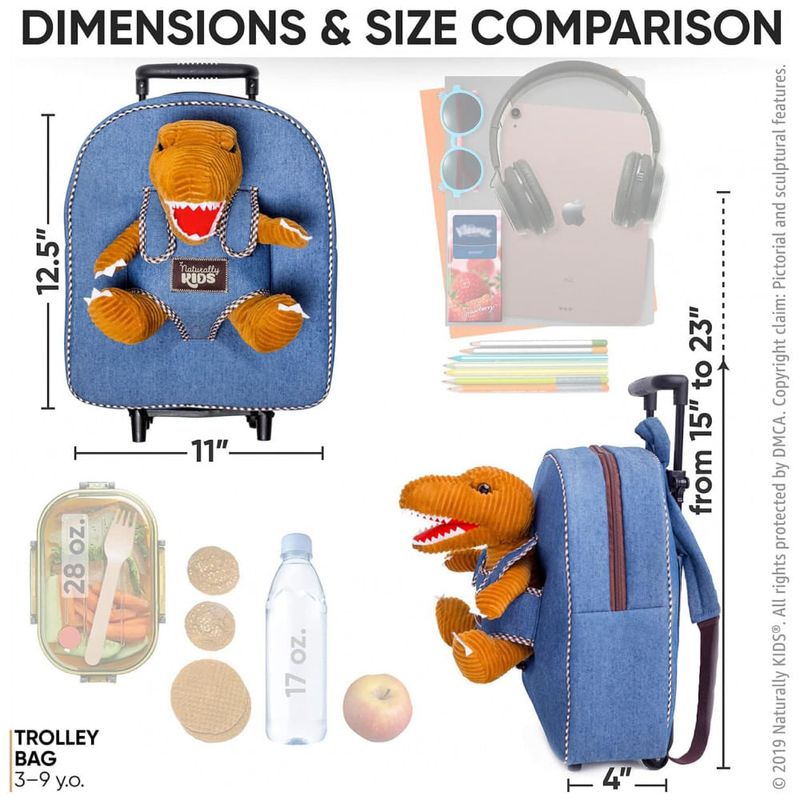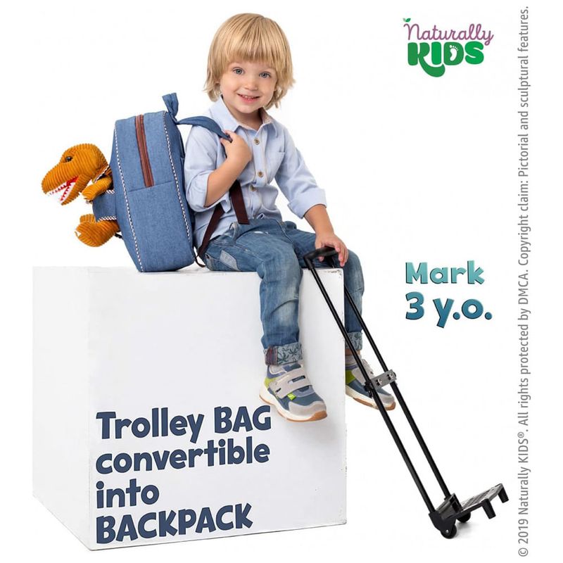 A mochila infantil de rodinhas Naturally KIDS com dinossauro foi desenvolvida para crianças de 3 a 6 anos, unindo formato de mala de viagem compacta com função de mochila sobre rodas para passeios e viagens curtas. O design em tecido tipo jeans com estampa de dinossauro traz na parte frontal um dinossauro de pelúcia removível, que pode ser usado separadamente como brinquedo durante o trajeto ou em casa.