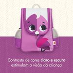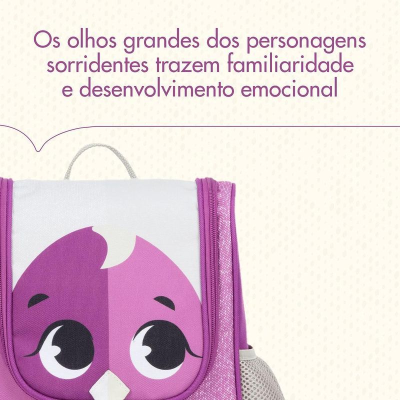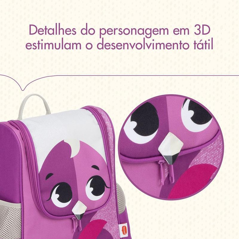 •Design Lúdico com Estímulos Sensoriais : Inspirada nos animais do Safari, a mochila conta com um amigo bichinho com detalhes em 3D, como olhos grandes e sorriso amistoso, que estimulam o desenvolvimento emocional, visual e tátil da criança.