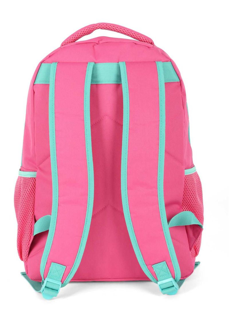 Em tamanho 16" ela é produzida em poliéster e seu painel frontal é em PVC cristal com personagens em relevo. Possui 2 bolsos laterais, compartimento amplo para armazenagem dos materiais e zíper com puxador personalizado. Alças acolchoadas e com ajuste para maior conforto.