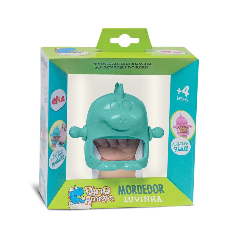 Mordedor tipo Luvinha do Dino na cor verde, com bracinhos em formato anatômico com alça para o bebê segurar. Indicado para bebês acima de quatro meses de idade. Mordedor em vinil verde com textura para gengivas sensíveis.