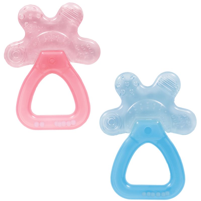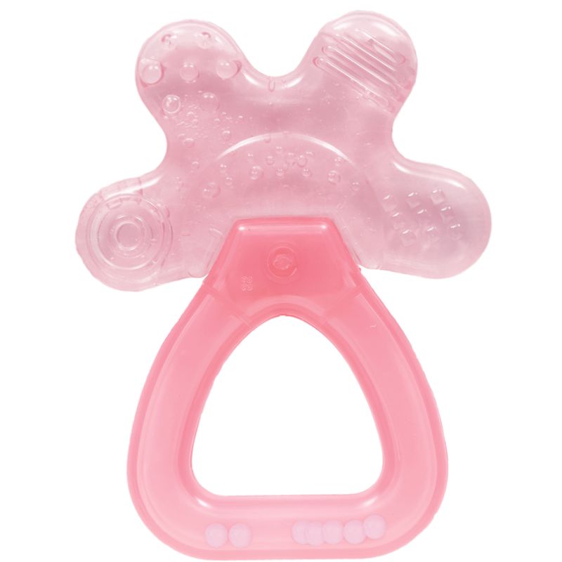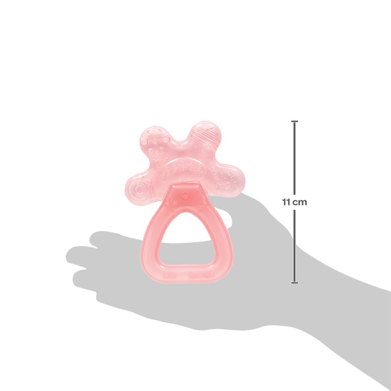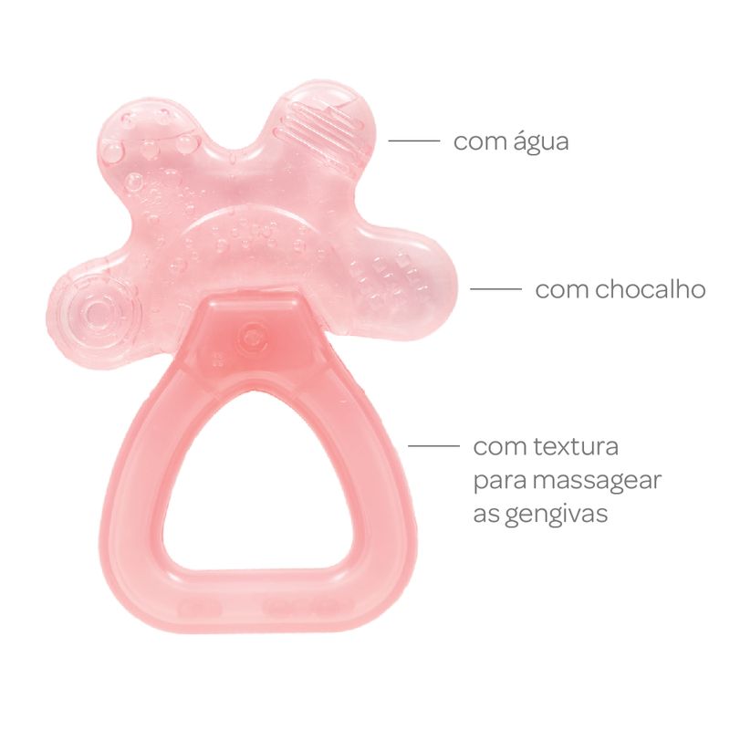 O interior do mordedor contém água. Ao ser resfriado na geladeira, o mordedor gelado proporciona uma sensação de alívio e frescor para o bebê.