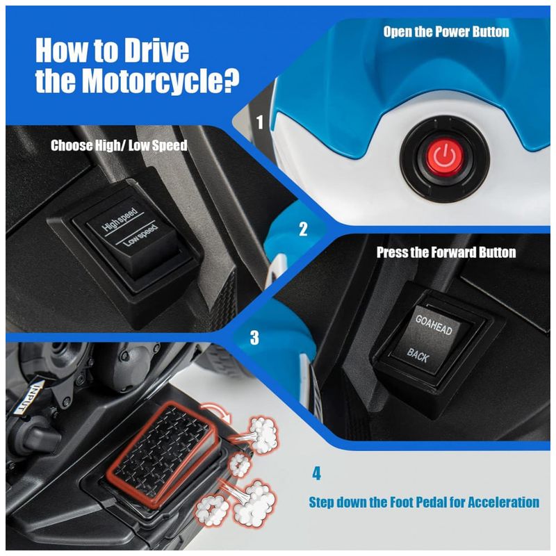 Fácil de montar e controlar A operação superfácil liberta seus filhos do aprendizado cansativo. As crianças só precisam pressionar o botão liga , desliga e pisar no pedal para acelerar. Depois de soltar o pedal, a motocicleta infantil pode parar imediatamente. E também há interruptores de velocidade alta, baixa e avanço, reverso.