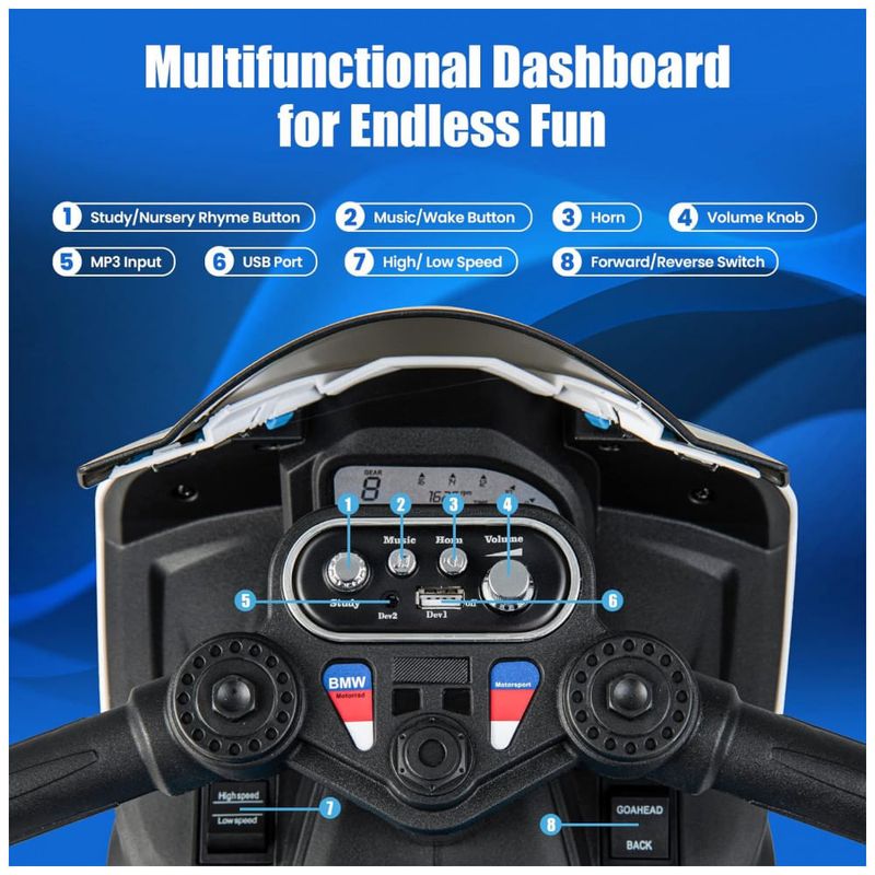 Aparência autêntica e design confortável Com aparência legal, tubo de escape simulado e farol brilhante, o passeio de motocicleta licenciado pela BMW foi projetado para imitar uma motocicleta real. Além disso, o assento estendido e as alças fáceis de segurar proporcionam às crianças uma experiência de direção confortável.