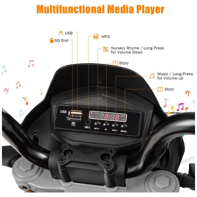 Música e histórias animam as crianças a motocicleta adota várias músicas e histórias interessantes para entreter extremamente seus filhos. Ou seus filhos podem ouvir suas músicas preferidas, desde que você conecte um dispositivo de música com porta USB e MP3 equipada lá. O volume ajustável adiciona mais conveniência. Além disso, o farol e a luz traseira são capazes de iluminar na escuridão.