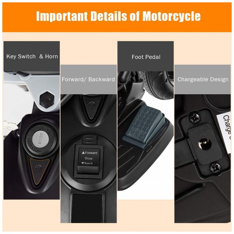 Experiência de condução simples e confortável a chave de arranque torna mais fácil para as crianças ligar ou parar a motocicleta. A função para frente e para trás pode ser realizada por meio do pedal. E o assento curvo que se ajusta bem à curva do corpo das crianças é capaz de melhorar o nível de conforto ao dirigir.