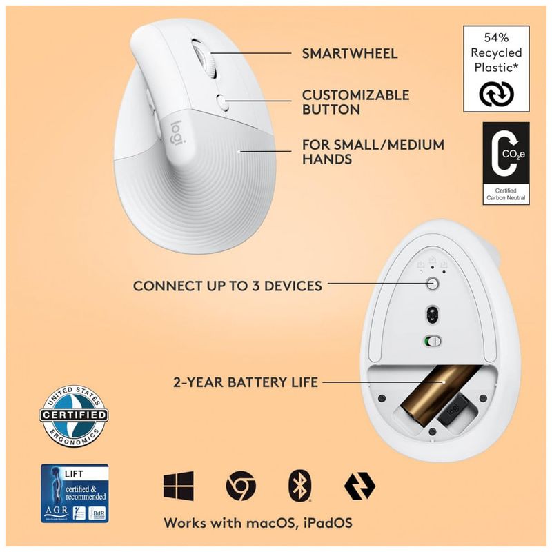 Ergo certificado o mouse vertical sem fio Lift foi projetado, desenvolvido, testado e aprovado de acordo com os critérios estabelecidos pelos principais ergonomistas.
