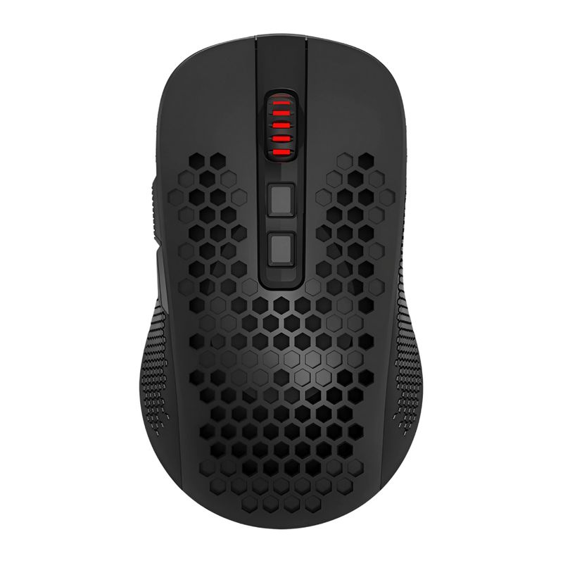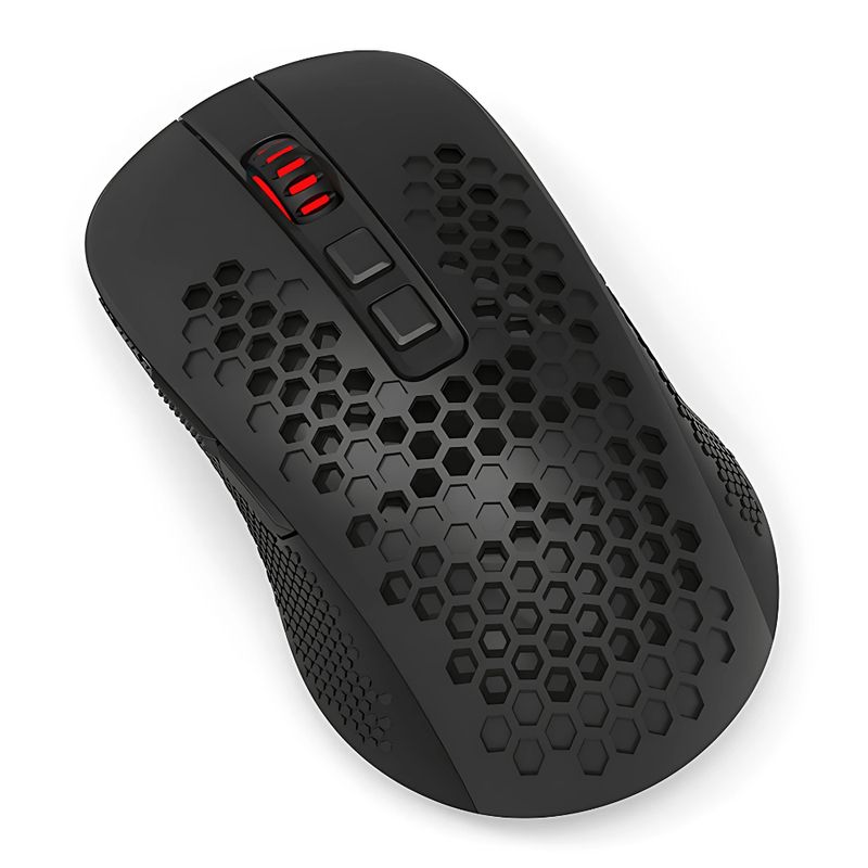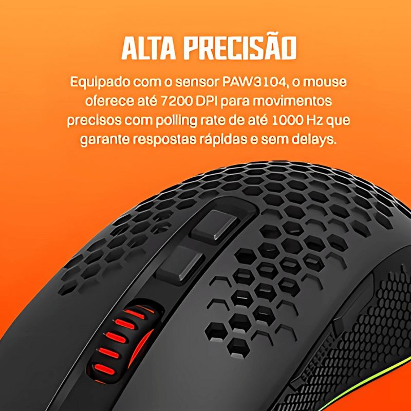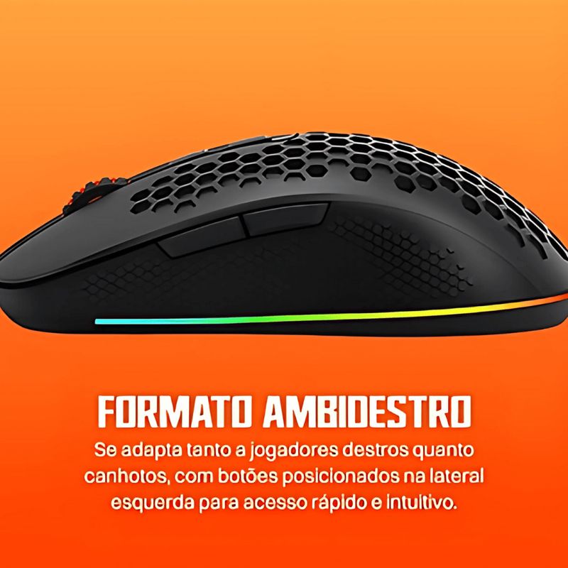 Mouse com carcaça perfurada estilo honeycomb, sensor óptico de até 7200 DPI, peso ultraleve de 83g e conectividade versátil via USB-C, 2.4GHz sem fio e Bluetooth. Conta com iluminação RGB, 7 botões programáveis e design ambidestro com botões laterais do lado esquerdo.
