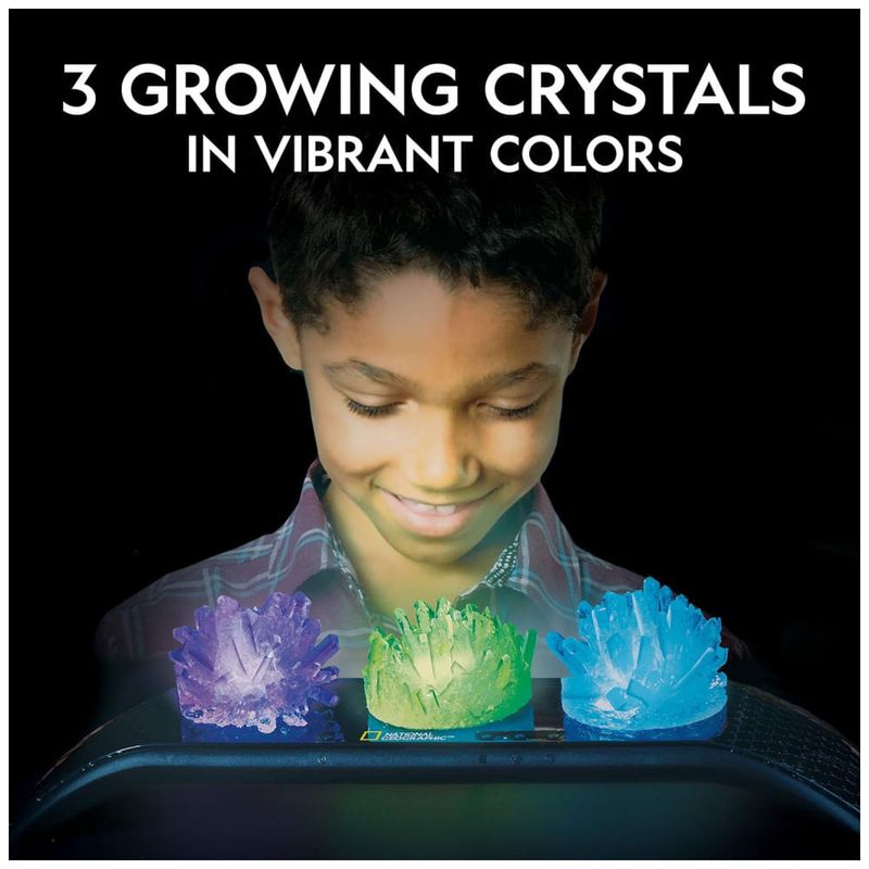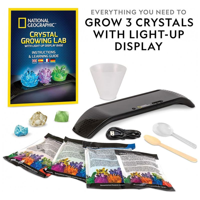 KIT DE CRESCIMENTO DE CRISTAL COM EXIBIÇÃO ILUMINADA Faça crescer três cristais vibrantes e exiba os em uma elegante base de exibição iluminada As crianças podem ver os cristais tomarem forma diante de seus olhos e aprenderão tudo sobre a ciência dos cristais em nosso guia de aprendizagem.