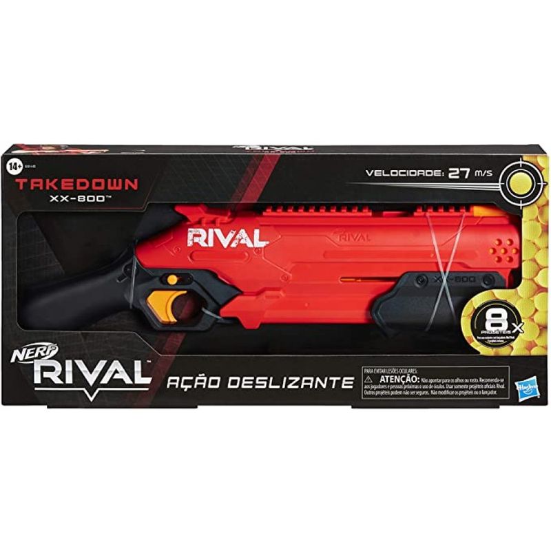 Nerf Rival, essa linha leva a brincadeira de Nerf para um outro nível. Os projéteis são bolinhas de espuma que ao lançar são superpotentes. É necessário sempre usar óculos de segurança no momento da brincadeira (vendido separadamente). A Nerf Takedown possui 8 projéteis e uma trava de segurança para não lançar automaticamente. Possui Carrilho na parte superior para adicionar a mira ou outro componente (vendido separadamente).