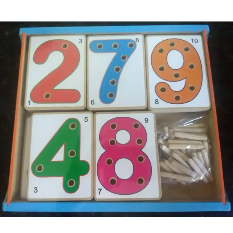 Os números de 0 a 9 possuem pinos que se encaixam permitindo que a criança faça a correspondência NUMERAL/QUANTIDADE, que é uma das primeiras noções do aprendizado da matemática. Além de auxiliar na contagem e correspondência este material estimula o reconhecimento e a escrita dos numerais.