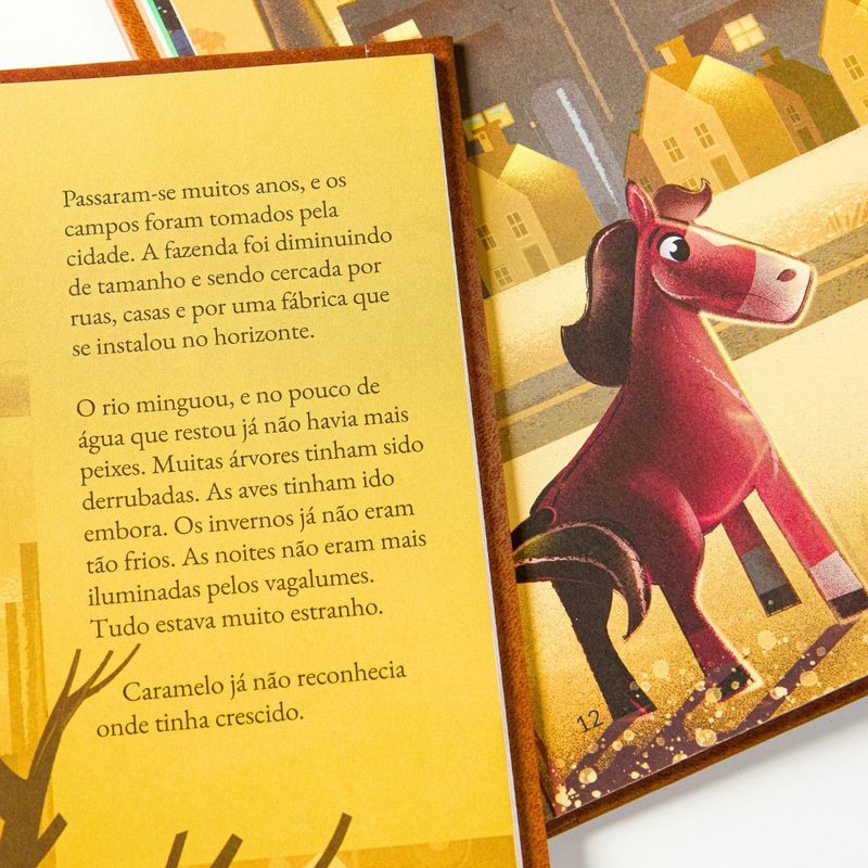 - Conta a história do Cavalo Caramelo, desde a sua infância até quando se deparou com os eventos climáticos extremos que causaram as enchentes no Rio Grande do Sul;