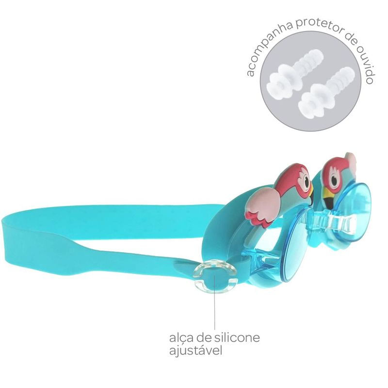 Acompanha protetor auricular para proteger os ouvidos da água. Para aumentar o efeito antiembaçante, mergulhe as lentes na água por alguns segundos antes de usar.