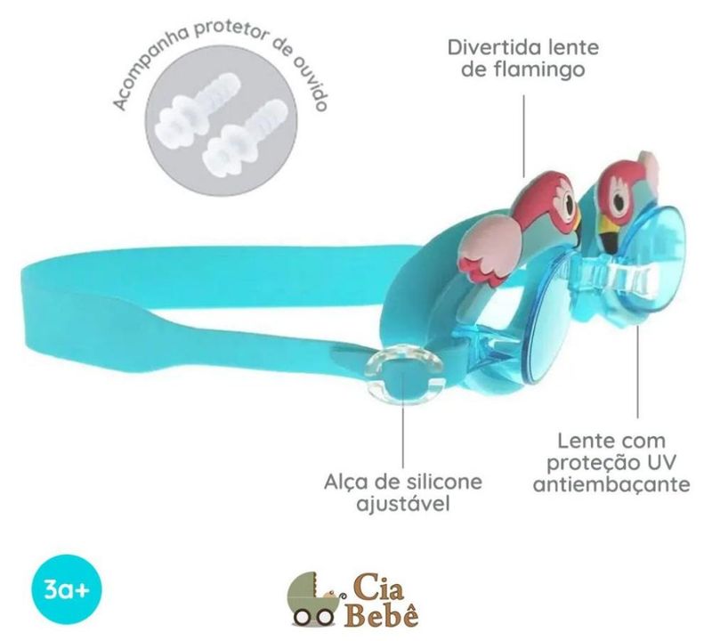 Composição: Alça e ventosa: 100% Silicone; Lentes e ajustador: 100% Policarbonato (PC); Personagem, narigueira, protetores auriculares e estojo: 100% Policloreto de Vinila (PVC)