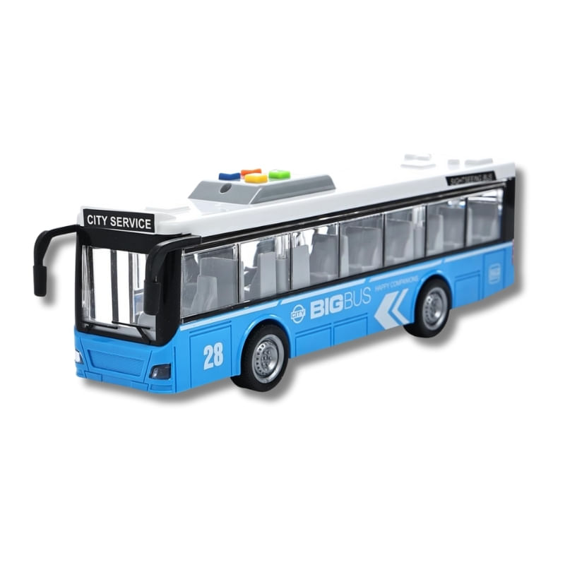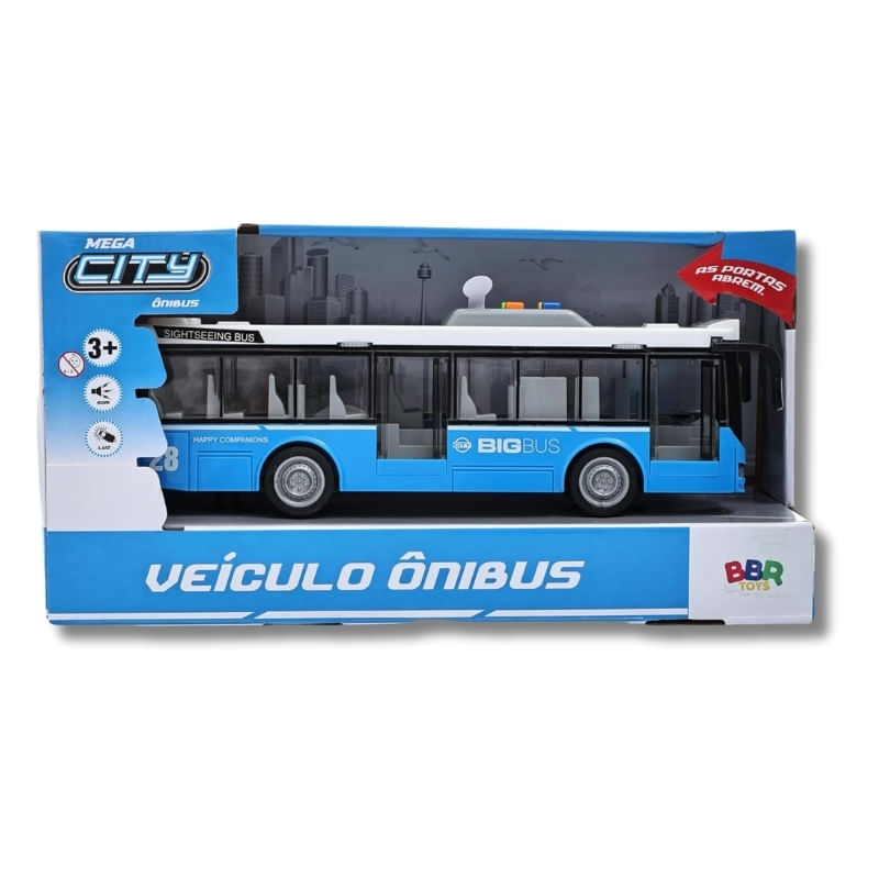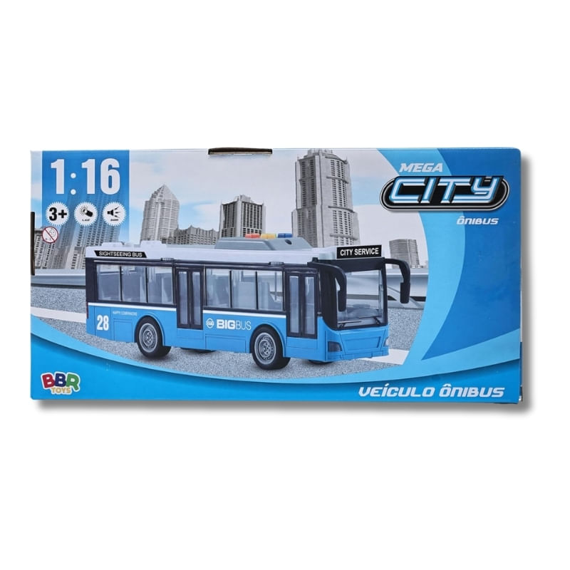 O ônibus da Mega City foi feito para crianças que gostam de se divertir muito com carrinhos de brinquedo, estimulando a sua criatividade, imaginação e coordenação motora durante suas brincadeiras. Possui um design clássico, com detalhes incríveis e mecanismo de fricção nas rodas traseiras, ou seja, é só puxar o carrinho para trás em uma superfície que ele vai correr sozinho. Emite luzes na parte interna, sons de ônibus de verdade, como: sirene, buzina, partida do motor e ré, além de poder abrir as portas manualmente girando a engrenagem. Tamanho aproximado do carrinho: 9,5 cm altura x 7 cm de largura x 28,5 cm de profundidade. Escala 1:16 Especificações: - Idade recomendada: + 03 anos