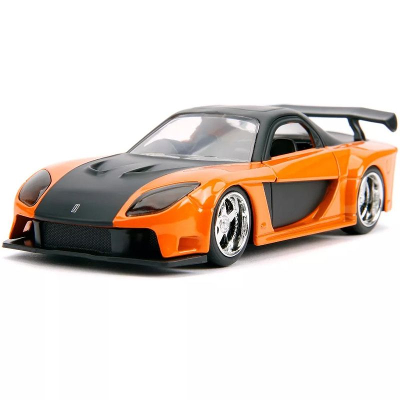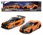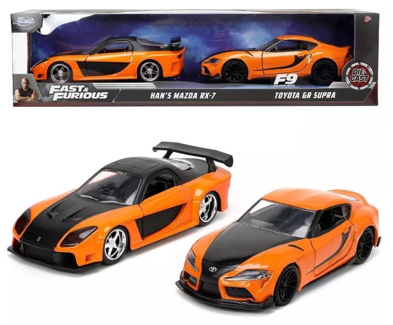 Pack c/ 2 Velozes e FuriososHan's Mazda RX-7 e Toyota GR-SupraMarca do produto: Jada.Coleção: Hollywood Rides - Fast & Furious.Escala: 1/32 (aproximadamente 12,5 cm de comprimento).Pneus de Borracha. Abre as portas.Miniatura em Metal com partes de plástico.