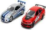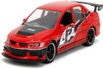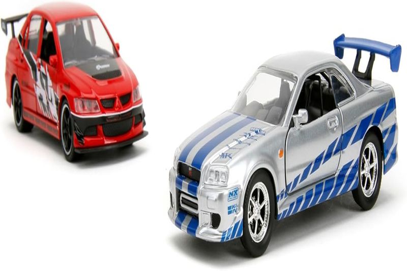Pack 2 - Mitsubishi Lancer Evolution IX e Brian's Nissan Skyline GT-R (BNR34) Marca do produto: Jada. Coleção: Hollywood Rides - Fast & Furious. Escala: 1/32 (aproximadamente 12,5 cm de comprimento). Pneus de Borracha. Abre as portas. Miniatura em Metal com partes de plástico.